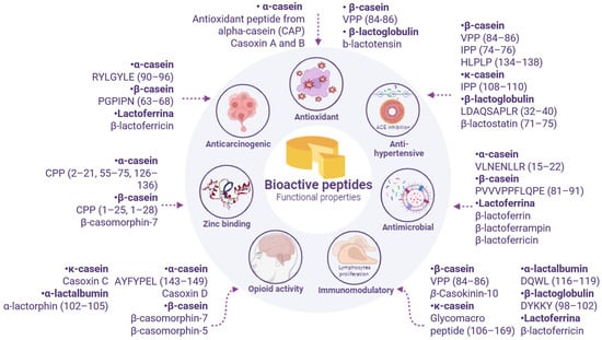 Although no specific physiological property has been proposed for the entire milk casein system, several authors have already demonstrated that these proteins are a good source of peptides that can influence several beneficial physiological responses in the body, which are known as bioactive peptides [11,17,18,19]. According to their size, they are classified into small peptides (less than 7 amino acids, the most active, but challenging to analyze with conventional proteomic approaches), medium peptides (7–25 amino acids), and large peptides (more than 25 amino acids) [20].