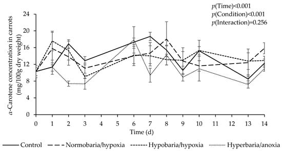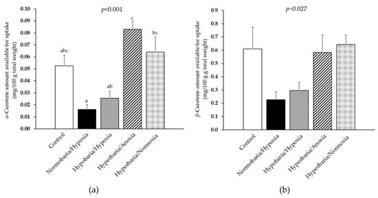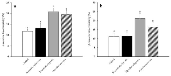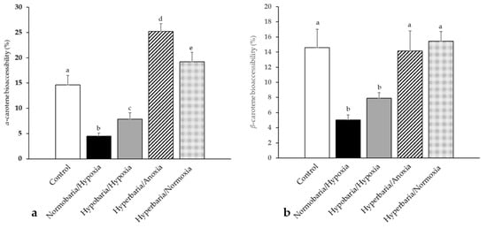 β-carotene in carrots stored under normobaric/hypoxic conditions did not significantly differ from those of the control carrots, while those of the carrots stored under hypobaric/hypoxic and hyperbaric/anoxic conditions were significantly higher than those of the control carrots. Since hypoxia alone did not impact the bioaccessibilities of