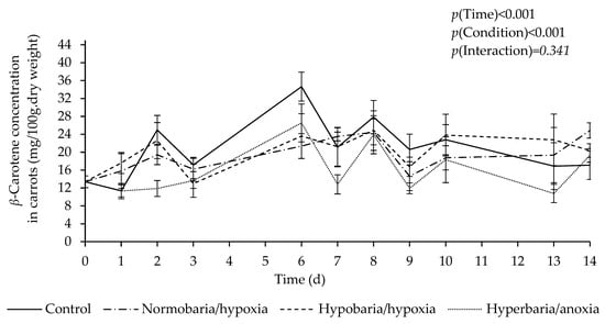 β-carotene in carrots stored under hypobaric/hypoxic conditions were not different from those in the control carrots. This, coupled with the observation that hypoxia alone did not impact the concentrations of