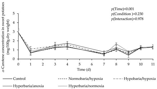 The results regarding the bioaccessibility of α- and β-carotene in sweet potatoes were different from those obtained in carrots. For α-carotene, there was a decrease in the bioaccessibility under normobaric/hypoxic and hypobaric/hypoxic conditions, while there was an increase under hyperbaric conditions, both in hypoxia and hyperoxia, compared to the control group. Although the increase in hyperbaria agrees with the results obtained for carrots, the decrease under normobaric/hypoxic and hypobaric/hypoxic conditions does not agree with the results obtained for carrots. For β-carotene, storage under hyperbaria, both in hypoxia and hyperoxia, did not result in an increase in bioaccessibility, whereas there was a decrease in bioaccessibility under normobaric/hypoxic and hypobaric/hypoxic conditions. Once again, the mechanisms for such differences are not known.
