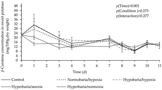 β-carotene synthesis during the post-harvest storage of carrots appeared to be greater than degradation, whereas this was the opposite for sweet potatoes. Thus, if hyperbaria was to exert its negative effect primarily on