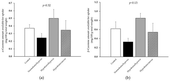β-carotene, our results strongly suggest that hypobaria and hyperbaria alone were responsible for the observed effect, although a synergistic effect of hyper-/hypobaria and hypoxia cannot be completely excluded. There are very few studies on the effect of post-harvest storage conditions on proVA carotenoid bioaccessibility. For example, one of the present authors (P.B.) has shown that carrots stored for 6 days at 20 °C had higher proVA carotenoid bioaccessibility than carrots stored for 3 days, although no mechanism explaining this difference was put forward. It is possible that hypo- and hyperbaria led to a modification of the food matrix, e.g., degradation of the cellulose structure of the cell wall and/or denaturation of carotenoid–protein complexes, resulting in a higher carotenoid release during digestion. However, further work, e.g., using microscopy techniques to examine cell structure, is needed to confirm these hypotheses and better understand the mechanisms involved.