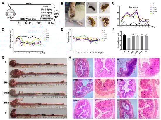 Therapeutic effect of EPP on rats with colitis. (A) Grouping and modeling of rats. (B) Different forms of rat feces. a. Diarrhea rats. b. Black, hard, shaped. c. Yellow, soft, half formed. d. Yellow, soft, shapeless. e. Blood fecal. (C) DAI score. (D) Changes in water consumption. (E) Changes in food intake. (F) Changes in colon length. (G) Measurement of colonic length in different groups. (H) H&E staining of colon tissue, observed at 40× and 100× magnification. * p < 0.05 vs. the control group. # p < 0.05 vs. the model group. The box shows the high magnification portion of the observation, and the arrow shows the lesion site.