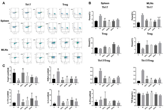 Effect of EPP on Th17/Treg balance. (A) Flow cytometry of the spleen and mesenteric lymph nodes. (B) Ratio of Th17 and Treg cells in the spleen and mesenteric lymph nodes. (C) Detection of genes and cytokines associated with Th17/Treg balance. * A significant difference compared with the control group, p < 0.05. ** A highly significant difference compared with the control group, p < 0.01. # A significant difference compared with the model group, p < 0.05. ## A highly significant difference compared with the model group, p < 0.01.