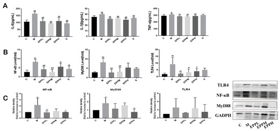 As demonstrated in Figure 3A, the levels of IL-6 and IL-1β in serum were significantly increased in the M group (p < 0.01). However, the EPP in each dose group and the S group could significantly reduce this trend (p < 0.01). Additionally, the TNF-α level was significantly increased in the M group (p < 0.05), but EPP with each dose showed a significant alleviation of this trend (p < 0.01), even better than the S group. Exposure to DSS caused a significant increase in TLR4, MyD88, and NF-κB expression in the colon (p < 0.01), which was significantly reversed in both EPPL and EPPM groups. The EPPH group showed no significant difference in MyD88 and NF-κB expression compared to the M group but significantly reduced TLR4 levels were apparent (Figure 3B). The results of the Western blotting suggested that DSS induced an increase in the expression of TLR4, MyD88, and NF-κB proteins in the rat colon, and the expression of MyD88 and NF-κB were significantly different from the C group (p < 0.05). Compared with the M group, the EPPL group significantly downregulated the expression of NF-κB (p < 0.05), and the EPPH group significantly downregulated the expression of NF-κB and MyD88 (p < 0.05). All three doses of EPP were effective in inhibiting DSS-induced elevation of TLR4 expression (Figure 3C). Overall, EPP may achieve anti-inflammatory effects through suppressing the TLR4/MyD88/NF-κB signalling pathway.