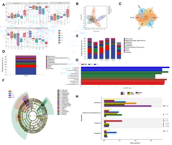 The differences in the gut microbiome are assumed to affect immune-associated diseases [26,27]. The observed species were presented for species richness and the Simpson index for species diversity. The PCA results in Figure 4B show that each group has obvious differences compared with the C group. There were 616 identical OTUs in each group (Figure 4A–C). The results showed that at the genus level, Akkermansia was the most abundant microflora detected in the rats used in this study. Staphylococcus, Allobaculum, Oscillospira, Lactobacillus, Ruminococcus, Blautia, Dorea, and Prevotella were also highly enriched. Compared with the C group, the proportions of Akkermansia, Staphylococcus, and Lactobacillus decreased in the M group, while the proportion of Allobaculum increased. Additionally, a dose-dependent increase in Akkermansia was observed after drug treatment in the EPP group. The Staphylococcus in the EPPL and EPPM groups was higher than that in the M group, while the Allobaculum in the EPPH group was lower than that in the M group; however, the Lactobacillus in the EPPH group was higher than that in the M group (Figure 4D,E). Different microbial genera among each group were analyzed by linear discriminant analysis combined with effect size measurement (LEfSe). o_Bacillales and c_Bacilli were significantly enriched in the C and EPPL groups, respectively, whereas g_Allobaculum was significantly enriched only in the M group (Figure 4F,G). Species-level analysis revealed that differences between different groups of bacteria, including Akkermansia, Staphylococcus, Allobaculum, and Lactobacillus, were different between the groups (Figure 4H).