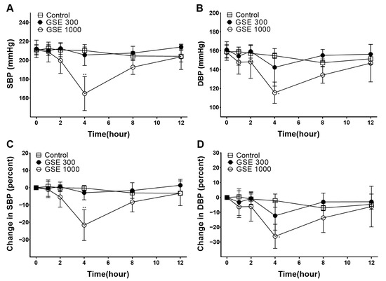 Measured blood pressure values and percentage changes in blood pressure after grayblue spicebush branch ethanol extract (GSE) administration (300 or 1000 mg/kg) in spontaneously hypertensive rats (SHR). (A,B) Measured systolic blood pressure (SBP) and diastolic blood pressure (DBP) values. (C,D) percentage changes in SBP and DBP. Values represent mean ± SEM (n = 4). * p < 0.05, ** p < 0.01 vs. control.