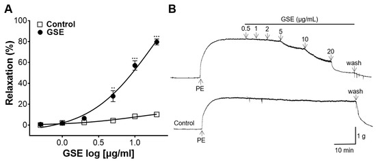 Vasorelaxant effect of grayblue spicebush branch ethanol extract (GSE). (A) Concentration–response curves and (B) isotonic changes in aortic rings contracted with phenylephrine (PE). Values represent mean ± SEM (n = 4–5). ** p < 0.01, *** p < 0.001 vs. control.