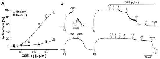 Vasorelaxant effect of grayblue spicebush branch ethanol extract (GSE) on endothelium-intact [Endo(+)] or -denuded [Endo(−)] rat aortic rings. (A) Concentration–response curves and (B) isotonic changes in aortic rings contracted with phenylephrine (PE). Values are mean ± SEM (n = 4). ** p < 0.01, *** p < 0.001 vs. control.