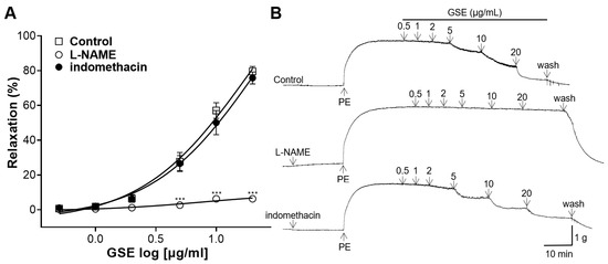 Effects of NG-nitro-L-arginine methyl ester (L-NAME) or indomethacin pretreatment on vasorelaxation effect of grayblue spicebush branch ethanol extract (GSE). (A) Concentration–response curves and (B) isotonic changes in aortic rings contracted with phenylephrine (PE). Values are mean ± SEM (n = 4–5). *** p < 0.001 vs. control.