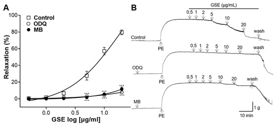 Effects of 1H-[1,2,4] Oxadiazolo [4,3-a]quinoxalin-1-one (ODQ) or methylene blue (MB) pretreatment on vasorelaxation of grayblue spicebush branch ethanol extract (GSE). (A) Concentration–response curves and (B) isotonic changes in aortic rings contracted with phenylephrine (PE). Values are mean ± SEM (n = 4–5). *** p < 0.001 vs. control.