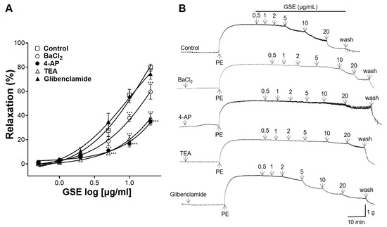 Effects of barium chloride (BaCl2), 4-aminopyridine (4-AP), tetraethylammonium (TEA), or glibenclamide pretreatment on vasorelaxation effect of grayblue spicebush branch ethanol extract (GSE). (A) Concentration–response curves and (B) isotonic changes in aortic rings contracted with phenylephrine (PE). Values are mean ± SEM (n = 4–5). *** p < 0.001 vs. control.