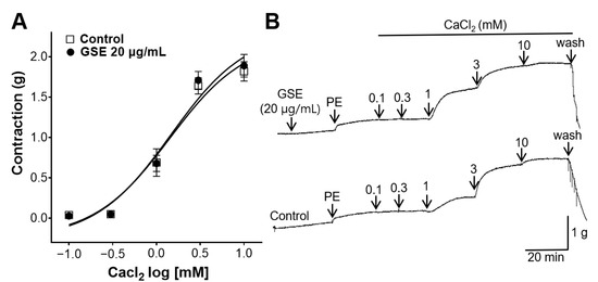 Before inducing constriction, GSE (20 μg/mL) was added to the aortic rings for 20 min. Then, CaCl2 was added cumulatively to induce contractions. However, no significant difference was observed between the rings pretreated with the GSE and the control group without a pretreatment (Figure 7).