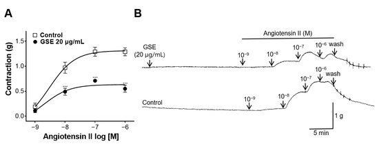 Before inducing constrictions, GSE (20 μg/mL) was added to the aortic rings. Then, Ang II was cumulatively added to induce contractions. The aortic rings pretreated with GSE showed inhibitory effects on vasoconstriction compared with the control group without a pretreatment (Figure 8).