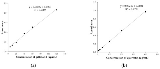 (a) Calibration curve of gallic acid; (b) calibration curve of quercetin.