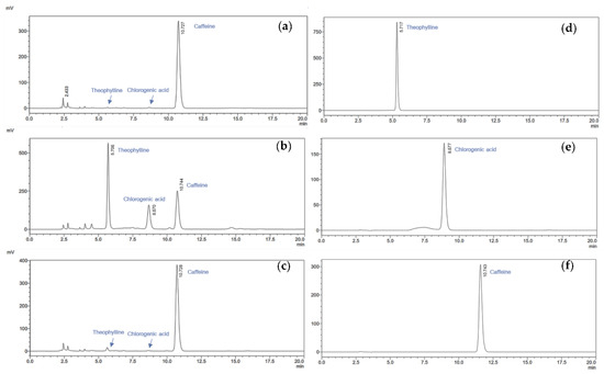HPLC chromatograms of the coffee cherry pulp extracts: (a) CCM, (b) CCS, and (c) CCU at a concentration of 1000 µg/mL and standard substances of (d) theophylline, (e) chlorogenic acid, and (f) caffeine at a concentration of 120 µg/mL were detected at 280 nm using C18 reversed phase column. The analysis was performed using the isocratic mixture of acetonitrile and 1% v/v acetic acid (15:85) with a flow rate of 1 mL/min for 20 min.