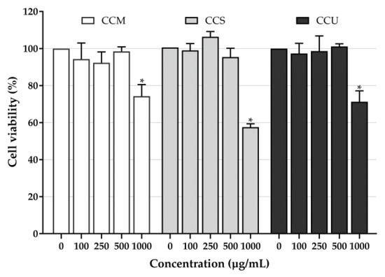 Effects of coffee cherry pulp extracts on the viability of HaCaT cells using the MTT assay; the bars represent the percent cell viability of HaCaT cells treated with different concentrations of the coffee cherry pulp extracts (100–1000 µg/mL) for 24 h. Data are shown as mean ± S.D. (n = 3). Asterisk (*) presents significant differences compared with the untreated cells (0 µg/mL) at p < 0.05.