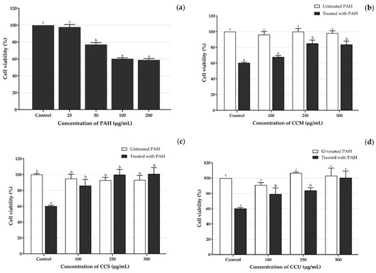 Effects of PAH on the viability of HaCaT cells using the MTT assay; the bars represent the percent cell viability of HaCaT cells (a) treated with different concentrations of the PAH (25–200 µg/mL) and the extracts; (b) CCM, (c) CCS and (d) CCU in different concentrations (100–500 µg/mL) were exposed to 100 µg/mL of PAH for 24 h. Data are shown as mean ± S.D. (n = 3). Tukey’s HSD test was performed to compare all group means to each other. Groups that share the same letters (a–c) do not exhibit significant differences at p < 0.05.