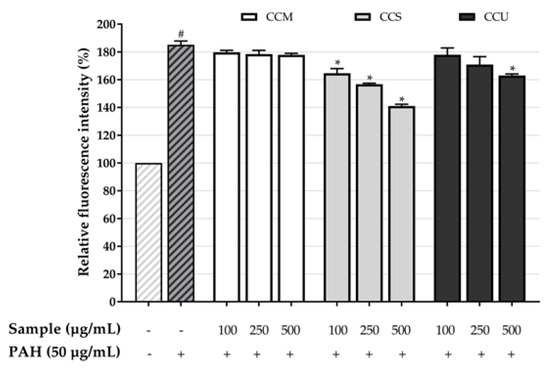 Percentage of relative intracellular ROS fluorescence intensity of coffee cherry pulp extracts at different concentrations of 100–500 μg/mL. The # p < 0.05 was significant compared with untreated cells (0 µg/mL). The * p < 0.05 was significant compared with the PAH-only control.