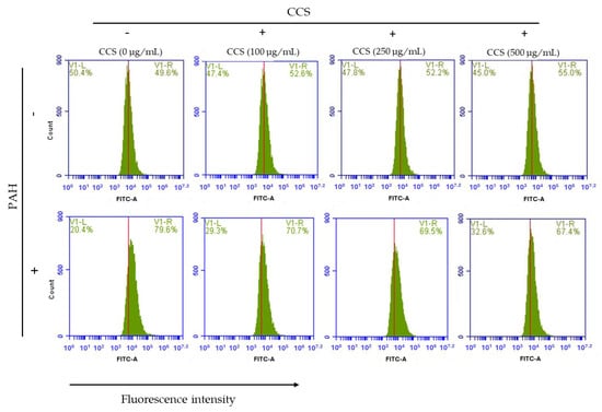 Flow cytometry was employed to investigate intracellular ROS generation. The oxidant-sensitive probe H2DCFDA was used to detect intracellular levels of ROS. According to the data illustrated in Figure 5, the relative fluorescence intensity of the HaCaT cells was compared between cells treated with PAH (50 μg/mL) in the absence and presence of coffee cherry pulp extracts at different concentrations of 100 to 500 μg/mL. The results indicated that the treatment of PAH (50 μg/mL) resulted in a significant increase in intracellular ROS levels as compared with the control group that did not receive any treatment. In comparison, after extracts treatment, only CCS at the lowest concentration from 100 to 500 μg/mL exhibited a considerable ability to mitigate the creation of the ROS generated by PAH without cell disruption from CCS itself (Figure 6). This finding suggests that treatment with CCS has the potential to prevent and suppress the intracellular generation of ROS in HaCaT cells that is caused by exposure to PAH.