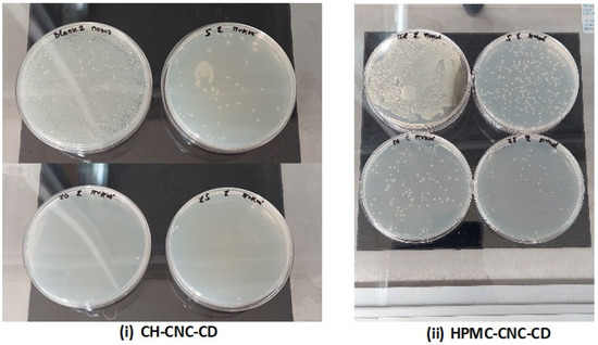Initially, solutions of CH-CNC-CD and HPMC-CNC-CD, in 50%-37.5%-12.5% proportions, were prepared, as described in Bizymis et al. [28,29]. Amounts of the 50 ppm AgNP solution were then added, at ratios of 0, 5, 10 and 15% v/v. Thereafter, the final solutions (with AgNP concentrations of 0, 2.5, 5.0 and 7.5 ppm, respectively) were homogenized, using a high-speed homogenizer (CAT Unidrive 1000, CAT Scientific, Paso Robles, CA, USA) for 10 min at a speed of 8000 rpm. All resulting solutions were degassed at 30 °C for 15 min, using an Elmasonic Ultrasonic device S30H (Elma Schmidbauer GmbH, Singen, Germany) (280 W/60 Hz). Subsequently, 20 mL aliquots were taken from the final solutions, placed in 9 cm Petri dishes and allowed to dry for 24 h at 50 °C in a vacuum oven. Finally, the dried films were kept at room temperature and humidity.