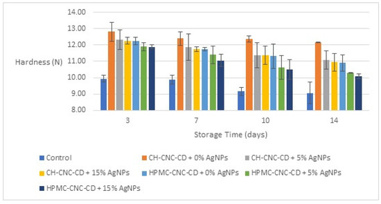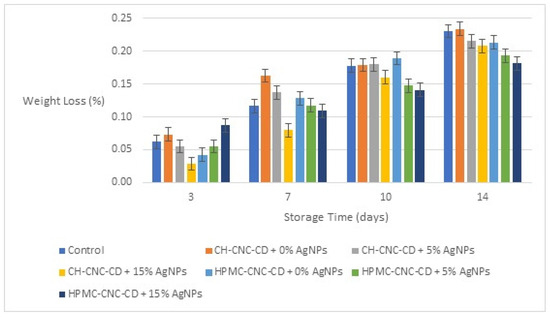 First the CH-CNC-CD and HPMC-CNC-CD solutions were prepared with incorporated AgNPs at levels of 0, 5 and 15% v/v, as described in Section 2.2. Next, the samples of cherries were placed in the solutions for 3 min and then allowed to dry for 30 min at room temperature. After drying, all samples were placed in PET/AL/PE (polyethylene terephthalate/aluminum foil/polyethylene) material bags (5 in each bag) and kept at 0 °C, which were considered as the appropriate conditions for the specific type and duration of the experiments. Control samples without edible films were also stored in the same way. In particular, the temperature was chosen to be low, to ensure that all samples would remain in a relatively good condition for the 14 days of storage, so that an effective comparison between all samples was possible.