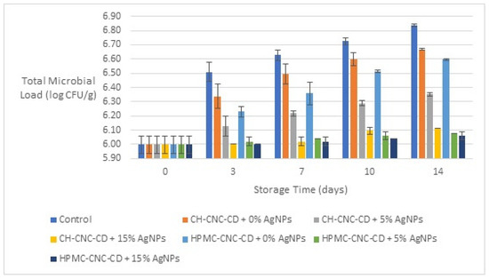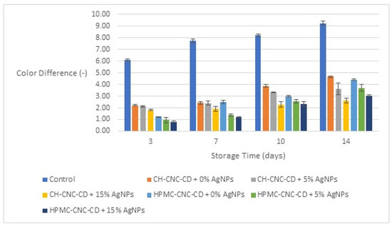 According to the results in Table 2, both types of films (CH-CNC-CD and HPMC-CNC-CD), before incorporating AgNPs, showed quite good levels of oxygen permeability (OP) and water vapor permeability (WVP) values, despite the tendency of CH and HPMC composite films to increase the relative humidity and form crosslinks with water [50,56,57,58]. Also, HPMC-CNC-CD films showed lower (p < 0.05) OP and WVP values compared to those of CH-CNC-CD.