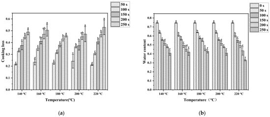 The water content and cooking loss of stir-fried pork tenderloin are shown in Figure 1. It can be observed that the longer stir-frying time resulted in a higher cooking loss and a lower water content. This was consistent with previous research showing that cooking loss in rabbit meat increased with longer heating times [20]. The water content of the raw pork tenderloin was the highest, about 75%, and decreased to 33% at most. The higher the cooking temperature of sample, the faster the water content decreased. Due to heat processing, protein denaturation and contraction reduced the water-holding capacity of muscle fibers, resulting in a gradual loss of water with the increase in stir-frying time. The moisture content in pork has an important influence on the texture, appearance, and flavor of pork meat. Meat product with slightly higher moisture content has a better chewiness and juiciness, which were considered to be important factors in determining the quality of meat [21]. A previous study showed that during steak frying, the sensory score of juiciness would significantly decrease with the increase in moisture loss. When the moisture content dropped too low, it would lead to a decrease in palatability [22]. Considering the results, only when the water content of cooked pork is not lower than 40% could a relatively better edible quality be found. It was shown in Figure 1b that when the stir-frying time reached 250 s, the water content of most samples decreased to about 40%, so the stir frying time should not exceed 250 s.