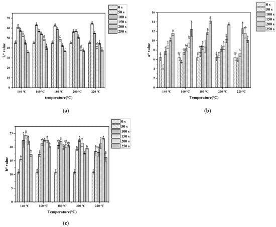 Cooking processes in both industry and the household have an influence on meat color, which directly influences purchasing desire [23,24]. The color change in meat products during cooking mainly depends on the thermal denaturation of myoglobin. Globin denaturation in myoglobin leads to the formation of denatured globin hemichrome, which is responsible for the dull-brown color in cooked meats. In addition, Maillard reaction products formed on the meat surface also contributed to the color variation [25,26]. L* value is one of the most vital indicators of evaluating meat product quality. The average L* value of uncooked pork tenderloin was 45.00, as indicated in Figure 2a. Compared to the control group, the L* value increased significantly within 50 s in the stir-frying process. After that, with the extension of stir-frying time, the L* value began to decline gradually. When the L* value decreased to 40, the surface color of pork tenderloin turned almost black. The mean a* and b* values of the control group were, respectively, 6.4 and 10.67. The a* value of the samples exhibited a remarkable increasing trend with time, while showed a decreasing trend from 200 s to 250 s at 220 °C. The change trend of the L* value and the a* value was in agreement with that reported for fried shrimp at different temperatures [27]. The b* value exhibited a trend of initially rising and then dropping, and the b* value of each treatment was higher than that of the control group. During the stir-frying process, due to the denaturation of myoglobin and the Maillard reaction, the pork tenderloin changed from white to golden yellow and, finally, to dark brown. Under the same cooking conditions, all b* values were greater than a* values, which showed that the yellow color of stir-fried samples occupied a dominant position. The data in Figure 2 showed that when the stir-frying time reached 250 s, the L* value of the pork tenderloin surface would drop below 40. In high-temperature, short-time cooking, time played more of a role than temperature in the color change in cooked meat. Therefore, too much stir-frying time is not recommended.
