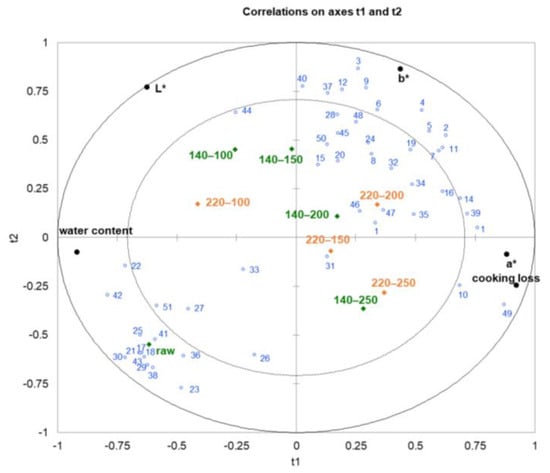 Meat’s physicochemical characteristics and volatile components can be drastically altered by heat treatment. The aroma attributes’ changes are accompanied by variations of other quality attributes. Normally, the detection of volatile substances in meat processing is cumbersome, and the determination of quality indicators is relatively convenient. Obtaining the correlation data between them could better realize the aroma prediction in the industrial production process. In this study, the correlations among quality attributes and volatile components were studied using partial least squares regression (PLSR) analysis, and the results are shown in Figure 3. As shown in Figure 3, the physical index and most volatile compounds were located between the inner and outer ellipses, demonstrating that they were remarkably explained by the PLSR model [42]. The x variables (R2 X = 0.894) explained the variation in the y variables (R2 Y = 0.505) according to the first two factors in the correlation loading plot for the volatile chemicals and the physicochemical indices. Factor 1 corresponded to increasing sample stir-frying times. Factor 1 explained a majority of the variance in both data sets, indicating that the effects of time in stir-frying processes were responsible for the majority of the covariance between the two data sets.