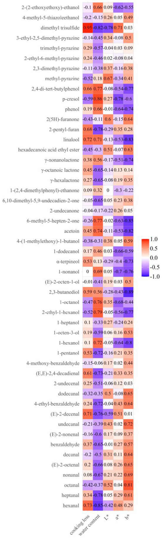 The correlation coefficients between the 50 detected volatiles and quality attributes, including L*, a*, b*, water content, and cooking loss, are shown in Figure 4. Among the quality attributes, b* value and water content had the strongest impact on the volatiles, while cooking loss, L* value, and a* value only showed strong correlations with a few volatile compounds, including hexanal, (E)-2-decenal, 1-nonanol, linalool, p-cresol, and dimethyl trisulfide. As shown in Figure 4, aldehydes showed a negative correlation with water content, while being positively correlated with the b* value. During the stir-frying process, the heat transferred rapidly to the pork samples. With an increased temperature, the water decreased, and the surface color changed. This process accelerated the oxidation reaction of fatty acids and resulted in the accumulation of aldehydes. The correlation coefficients for indexes of water content and b* value with alcohols were also higher than the others. Among alcohols, 1-pentanol, 1-octen-3-ol, 1-heptanol, (E)-2-octen-1-ol, and 4-(1-methylethoy)-1-butanol were negatively related to water content and showed a positive correlation with the b* value. As the products of lipid oxidation and heat degradation, these alcohols accumulated and helped to form the desired aroma of stir-fried samples. Among the ketones with high correlation with the physicochemical indexes, acetoin and 6-methyl-5-hepten-2-one were positively correlated with water content and negatively related to b* value. This could be linked to the abundance of these compounds in raw pork samples. The compound of 6,10-dimethyl-5,9-undecadien-2-one was negatively correlated to water content, but there was no obvious correlation between 6,10-dimethyl-5,9-undecadien-2-one and b* value. For esters, γ-nonanolactone was positively correlated with water content and had a negative correlation with b* value. γ-Nonanolactone, with milk aroma, was usually detected in the raw pork. However, other esters presented negative correlations with water content, which might be due to their formation through the esterification of organic acids and alcohols throughout the successive stir-frying phases. Phenolic compounds also showed positive correlations with water content and negatively correlated with b* value. The most likely source of phenolic compounds in pork tenderloin is animal feed, and they were found in raw pork samples and decreased after cooking. Pyrazines were negatively related to water content, but the correlation between pyrazines and physicochemical attributes was relatively small. This might be due to the coexistence of multiple reactions in the food processing system and the complexity and interaction between different reactions, so the compounds derived from the same reaction type or the same reaction pathway cannot present an ideal correlation. To sum up, the water content and b* value could be used as potential indicators of flavor in pork tenderloin during stir frying.