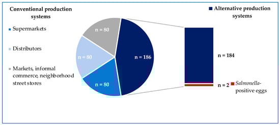 In this study, we did not observe significant differences between the presence of Salmonella in conventional or alternative production systems (p = 0.1). However, we detected that two samples (1.1%, 2/186) obtained from cage-free hens that roam in open, less protected environments were contaminated with Salmonella serotype Enteritidis. These conditions could increase the likelihood of Salmonella contamination in egg production environments. Although the following factors were not analyzed in the study, egg safety, and thus the presence of Salmonella in eggs obtained from alternative systems, also depends on the flock density, the exposure to contaminated feces and substrate, dust, vectors, the stress level of the hens, and the location of the nesting boxes, among others. It must be considered that the internal content of eggs might also be contaminated and present different levels of Salmonella compared to the egg’s surface; therefore, the reported results can be underestimated.