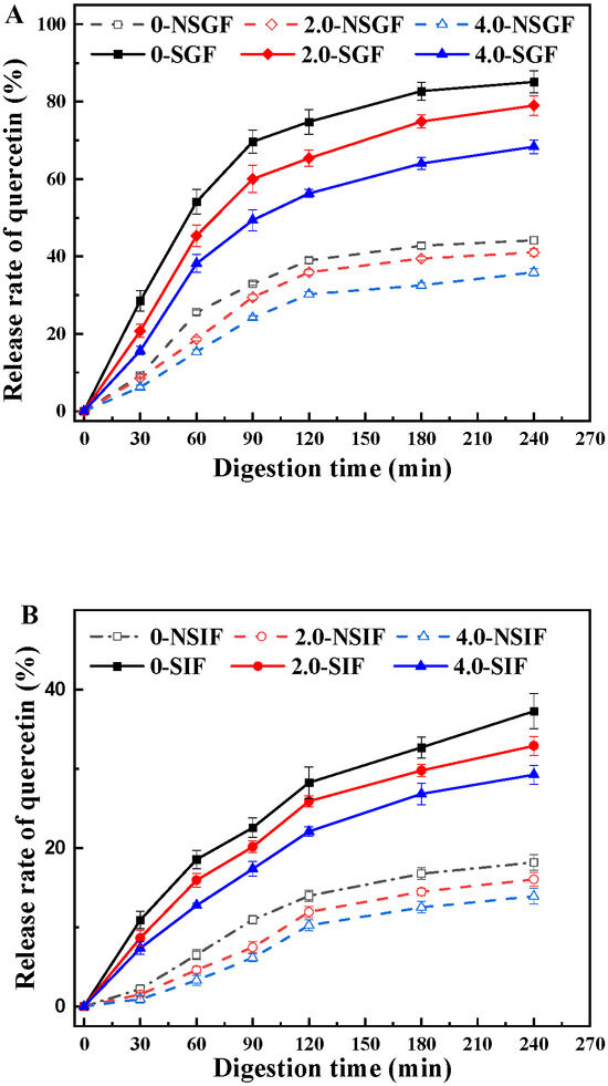 3.4. In Vitro Release of Quercetin in BSA-SS Composite Cold-Set Gel