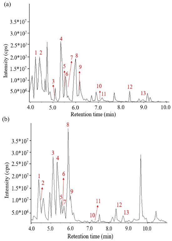 LC–MS chromatogram of (a) total ion current-N and (b) total ion current-P of 13 ginsenosides.