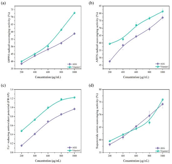 The anion-scavenging potential of AGGs on superoxide radicals was evaluated by employing a previously reported method with minor alterations [17]. Briefly, 50 μL of prepared solutions with concentrations of 200, 400, 600, 800, and 1000 μg/mL was combined with 50 μL of PMS solution (60 μM), 50 μL of NADH solution (156 μM), and 50 μL of NBT solution (156 μM). After a 5 min incubation at 25 °C, the measurement of Abs was performed at a wavelength of 560 nm. VC served as the positive control. The superoxide-radical-scavenging activity of the samples was determined using the following formula: