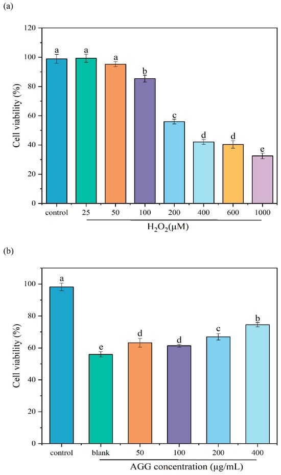 Effects of (a) different concentrations of H2O2 and (b) AGGs on cell viability of RAW 264.7 macrophages induced by H2O2. Different letters (a–e) mean significantly different at p < 0.05. Note: control: without-H2O2 treatment group; blank: group treated with only 200 μM H2O2.