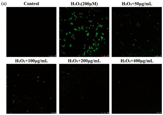 The intracellular reactive oxygen species (ROS)-scavenging potential of AGGs was determined by employing the fluorescent probe DCFH-DA following the established method [21]. Concisely, RAW 264.7 macrophages were grown in glass-bottomed confocal microscope dishes (15 mm diameter, 5 × 105 cells per dish) for 24 h. Afterward, each well was pretreated with diverse concentrations of AGGs (50, 100, 200, and 400 μg/mL) for 2 h, after which cells were co-stimulated with H2O2 at a concentration of 200 μM for 2 h. Cells treated without H2O2 and with H2O2 alone served as a blank control and a positive control, respectively. Following that, the cells were subjected to three washes with PBS to eliminate suspended dead cells, and the cells were stained with 20 μM DCFH-DA (dissolved in serum-free DMEM) for 30 min and incubated at 37 °C in the absence of light. After incubation, the supernatant liquid was discarded, and the cells were subjected to three washes with PBS again to remove the excessive DCFH-DA. Finally, the ROS levels were measured by laser confocal scanning microscopy. The excitation (Ex) and emission (Em) wavelengths were 488 nm and 528 nm.