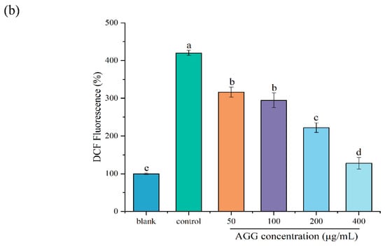 Extensive research has shown that oxidative stress is related to diverse diseases, making the prevention of oxidative stress a crucial bioactivity for functional foods. The H2O2-induced oxidative injury model in RAW 264.7 macrophages has recently become a well-established and commonly used in vitro model for evaluating antioxidant activities [28]. In this work, the protective effect of AGGs on H2O2-induced oxidative injury in RAW 264.7 macrophages was investigated (Figure 3). Firstly, to create a cellular model of oxidative injury induced by H2O2, the effect of various H2O2 concentrations on the cell viability of RAW 264.7 macrophages was examined. It was observed that the percentage of cell viability decreased from 98.91 ± 2.80% to 55.97 ± 1.54% upon treatment with 200 μM of H2O2, which was used for subsequent experiments. As anticipated, pretreatment with AGGs at concentrations ranging from 50 to 400 μg/mL exhibited a dose-dependent increase in cell viability, indicating the protective effect of AGGs against H2O2-induced oxidative injury.