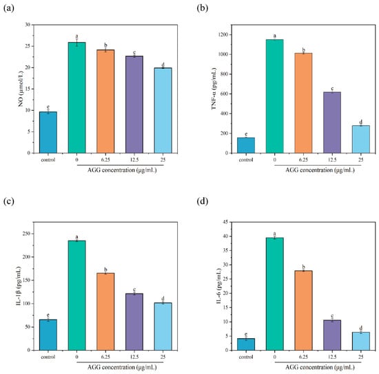 The anti-inflammatory effects of AGGs on RAW 264.7 macrophages stimulated by LPS were tested by employing a previously reported method with minor modifications [1]. In brief, RAW 264.7 macrophages were cultured at a density of 2 × 104 cells/mL and then classified into five groups: control, LPS-stimulated model group, and AGG intervention groups (6.25, 12.5, and 25 µg/mL). The control group was cultured using DMEM, while the LPS-stimulated model group was cultured using 1 µg/mL LPS for 24 h. The AGG intervention groups were pretreated with DMEM solutions containing 6.25, 12.5, and 25 µg/mL of AGGs for 2 h, followed by stimulation using 1 µg/mL LPS for another 24 h. Lastly, the supernatants of RAW 264.7 macrophages were used to evaluate the levels of NO, TNF-α, IL-6, and IL-1β, according to the instructions of the corresponding kits.