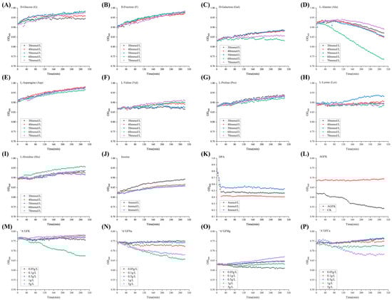 Preliminary screening of the germination effect of germinants. (A–I) Growth curves of spores under the influence of different concentrations (30 mmol/L, 40 mmol/L, 50 mmol/L, 60 mmol/L, 70 mmol/L) of D-glucose (G), D-fructose (F), D-galactose (Gal), L-Alanine (Ala), L-Asparagine (Asp), L-Valine (Val), L-Proline (Pro), L-Lysine (Lys), and L-Histidine (His). (J,K) Growth curves of spores under the influence of inosine at concentrations of 4 mmol/L, 6 mmol/L, and 8 mmol/L, and DPA at concentrations of 4 mmol/L, 6 mmol/L, and 8 mmol/L. (L) Growth curve of spores under the influence of AGFK (10 mmol/L Asp, 10 mmol/L G, 10 mmol/L F, 50 mmol/L KCl). (M–P) Growth curves of spores under the influence of Ala (60 mmol/L), G (10 mmol/L), and F (10 mmol/L) in the presence of KCl/NaCl/MgCl2/CaCl2 at concentrations of 0.05 g/L, 0.1 g/L, 0.5 g/L, 1 g/L, and 5 g/L. For detailed information on the treatment groups, please refer to Table 1.