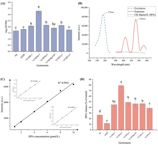 Furthermore, the DPA release rate results are consistent with the observed thermal inactivation results. As illustrated in Figure 2B, the TbCl3-6H2O complex with DPA displayed peak excitation and emission wavelengths at 272 nm and 542 nm, respectively. Standard curves displaying the relationship between DPA concentration (concentration 0.1–1 μmol/L, 1–10 μmol/L, 10–100 μmol/L) and fluorescence intensity were plotted (R2 = 0.9965, 0.9954, 0.9941) (Figure 2C). Among the tested combinations, “A”GFNa-1 consistently demonstrated the highest performance, with a DPA release rate of up to 80%. The DPA release rates of the spores ranged between 40% and 50% following treatment with “A”GFK-1, “A”GFNa-5, “A”GFMg-0.05, “A”GFCa-1, and “A”GFCa-5 (Figure 2D). However, in comparison to the 72% DPA release rate reported by Zhu et al. [], our study only achieved a 10% release of DPA with the AGFK treatment. This disparity may be attributed to differences in spore strains and inner membrane receptors. In summary, the “A”GFNa-1 germinant was chosen for further experimentation.