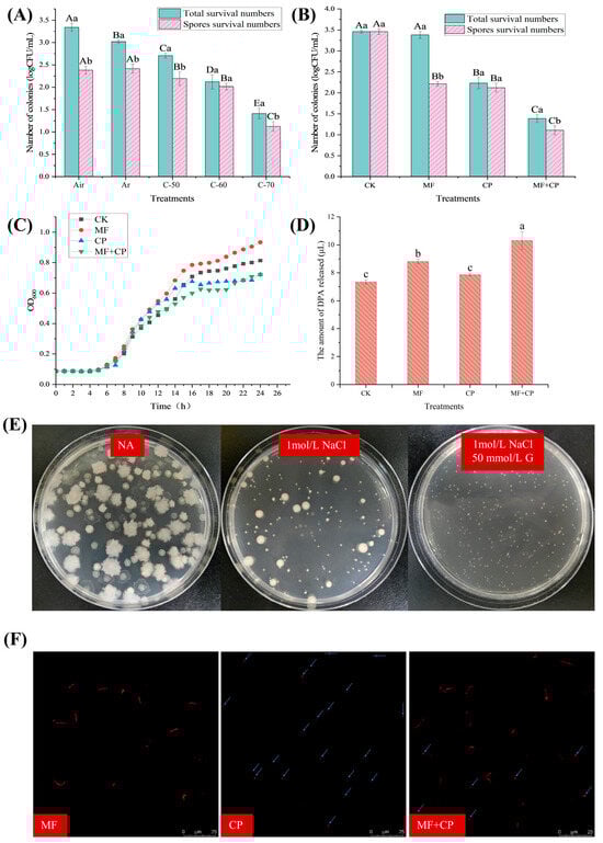 (A) Thermal inactivation of B. licheniformis under different conditions: air (100% air, no cold plasma), Ar (100% argon, no cold plasma), C-50 (100% argon packed, 50 kV cold plasma), C-60 (100% argon packed, 60 kV cold plasma), and C-70 (100% argon packed, 70 kV cold plasma). (B) Thermal inactivation of B. licheniformis under different treatments: CK (no germination, no cold plasma), MF (germination only), CP (no germination, 100% argon packed, 70 kV cold plasma for 3 min), and MF + CP (germination for 5 h, 100% argon packed, 70 kV cold plasma for 3 min). (C) Determination of B. licheniformis growth curves under different treatments: CK, MF, CP, and CP + MF. (D) DPA release rate of B. licheniformis spores under different treatments: CK, MF, CP, and CP + MF. (E) Survival status of B. licheniformis spores in hypertonic medium with different conditions: NA, NA + 1 mol/L NaCl, and NA + 1 mol/L NaCl + 50 mmol/L glucose. (F) Analysis of B. licheniformis spores using confocal laser scanning microscope (CLSM) under different treatments: MF, CP, and MF + CP. Error bars represent the standard deviations of the mean (n = 3). Upper case letters indicate significant differences between groups (p < 0.05) and lowercase letters indicate significant differences within groups (p < 0.05).