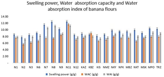 The results showed that the water absorption capacity (WAC) for the cultivars ranged between 5.66 (N2) and 11.68% (N11). Similar results have been reported by other authors [20,41]. The WAC of hybrid cultivars ranged from 5.66 to 11.68, and that of landraces from 6.55 to 9.01. This implies that both hybrid and landrace cultivars that had a high WAC (N9, N11, KBZ, and NKYK) are suitable for use in food and pharmaceutical industries. Only one hybrid cultivar (N2) showed a very low WAC, and hence was not suitable for use in the food industry. Figure 1 shows a graphical representation of water absorption capacity of the selected banana flours. As the WAC increased, WAI and SP also increased. Pearson’s correlation coefficient showed that WAC was positively correlated with WAI (r = 0.62) and swelling power (r = 0.60), but negatively correlated with freeze–thaw stability (r = −0.40).