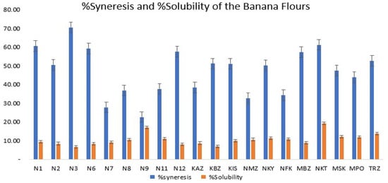 These results are in agreement with those reported by other authors [33,35,36,37,38], who noted that SP relates to pasting characteristics and rheological properties. On the contrary, Alimi et al. [34] reported a range of 1.75–3.2 g/g on false banana, whereas Olatunde et al. [11] reported values of 1.38 and 2.14 g/g for native banana, which is quite lower than the results obtained in this study. This implies that landraces have starch structures that are more open compared to hybrids, which makes them absorb more water during processing, hence making them suitable for use as adhesives in the food and nonfood industries. The greater SP values of N11, N9, N8, and N7 in the hybrids, and MPO and TRZ in the landraces, suggest a high gelatinization capacity. Low swelling power is not a good attribute for application in the food industry, as it affects the final yield of the products.