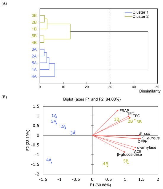 Agglomerative hierarchical clustering (AHC) (A) and principal component analysis (PCA) (B) of phenolic compounds, biological activity and antibacterial activity of pear pomace flour. Active observations: 1A–5A—maceration (cluster 2—blue); 1B–5B—two-step extraction (cluster 2—green). Active variables: TPC—total phenolic content; TFC—total flavonoid content; FRAP—ferric reducing antioxidant power; DPPH –2,2-diphenyl-1-picryl-hydrazyl-hydrate; ACE—angiotensin-converting enzyme. Variables “α-amylase”, “β-glucosidase” and “ACE” mean inhibitory activity against those enzymes (according to Table 1). Variables of “E. coli” and “S. aureus” mean antibacterial activity against them (according to Figure 3).