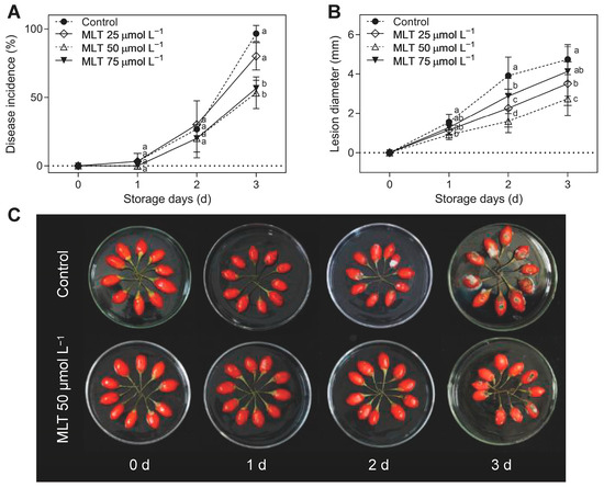 Disease incidence (A), lesion diameter (B), and visual appearance (C) in the untreated (control) and melatonin-treated (25, 50, and 75 μmol L−1) goji berries during storage at 28 °C; data are expressed as mean ± SD. The lowercase letters are used at each sample point to indicate a significant difference (p < 0.05) between control and melatonin-treated fruits.