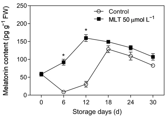 Endogenous melatonin content in the untreated (control) and 50 μmol L−1 melatonin-treated (the most effective treatment) goji berries during storage at 4 ± 0.5 °C. Data are presented as mean ± SD. “*” at each sample point indicates a statistically significant difference (p < 0.05) between control fruits and melatonin-treated fruits.
