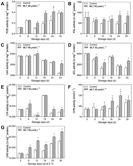 The activities of POD (A), PAL (B), C4H (C), 4CL (D), CHS (E), CHI (F), and CAD (G) in the untreated (control) and 50 μmol L−1 melatonin-treated goji berries during storage. Data are presented as mean ± SD. “*” at each sample point indicates a statistically significant difference (p < 0.05) between control fruits and melatonin-treated fruits.