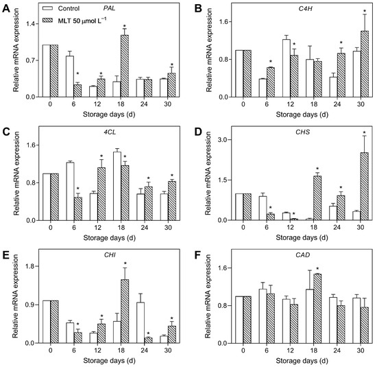 The expressions of PAL (A), C4H (B), 4CL (C), CHS (D), CHI (E), and CAD (F) in the untreated (control) and 50 μmol L−1 melatonin-treated goji berries during storage. Data are presented as mean ± SD. “*” at each sample point indicates a significant difference (p < 0.05) between control and melatonin-treated fruits.