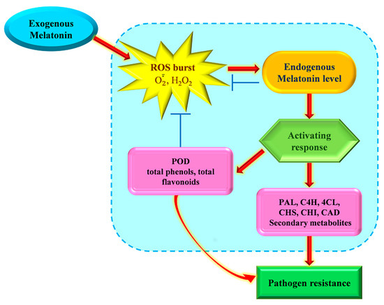 The phenylpropanoid pathway is a vital part of secondary metabolism, functioning as a defense response by meditating the accumulation of metabolites that can resist pathogen invasion and infection [37]. The enzyme PAL plays a crucial role in limiting the rate of the pathway, followed by sequential catalyzation with C4H and 4CL to produce coumaric acid and p-coumaroyl-CoA that act as crucial precursors for numerous phenylpropanoid products like flavonoids and lignin [25]. CHS and CHI catalyze the first two steps in the synthesis branch of flavonoids. CAD is the key enzyme in lignin synthesis bypass to produce monolignols [7]. In addition to acting as an antioxidant enzyme to scavenge ROS, POD also plays a vital role in the process of polymerizing monolignols to form lignin [7,33]. MLT acts as a bioregulator during biotic and abiotic stresses, activating and/or modulating metabolic pathways, related hormones, and key elements that act against stressors [15]. In the current study, the activities of POD, PAL, C4H, 4CL, CHS, CHI, and CAD, and the expressions of PAL, C4H, 4CL, CHS, CHI, and CAD in goji fruit were enhanced after exogenous MLT treatment during storage. Our results coincided with the findings of Qu et al. [25], who reported that MLT induced the activities and related genes of defense-related enzymes (POD, PAL, C4H, 4CL, and CAD), thus strengthening disease tolerance in postharvest blueberry fruit. In postharvest plum fruit [37] and papaya [34], MLT-induced increase in POD, PAL, C4H, and 4CL activities was found to be associated with reduced anthracnose and retention of fruit quality. As reviewed by Li et al. [33] and Arnao and Hernández-Ruiz [15], MLT treatment induces phenylpropanoid metabolism in the fruits by elevating the activities and expressions of phenylpropanoid pathway-related enzymes (e.g., PAL and POD), which in turn improves resistance against pathogens.